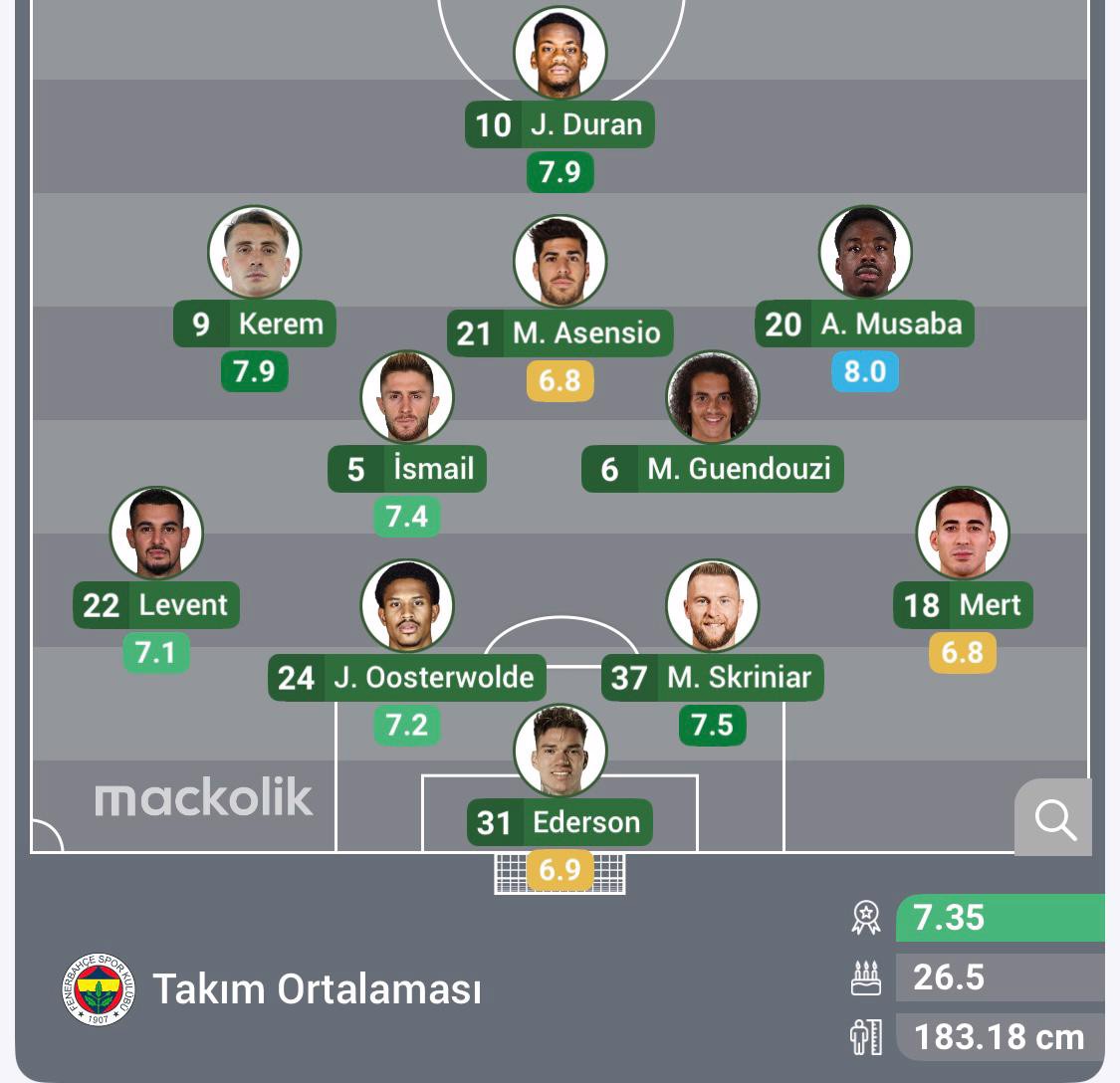 Fenerbahçe: Ederson, Mert, Skriniar, Oosterwolde, Levent, Guendouzi, İsmail, Musaba, Asensio, Kerem, Duran