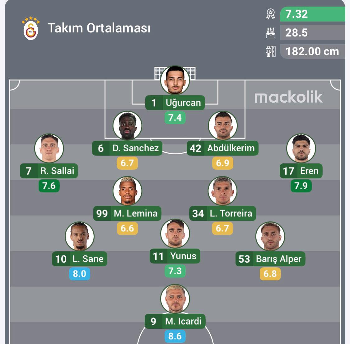 Galatasaray: Uğurcan, Sallai, Davinson, Abdülkerim, Eren, Lemina, Torreira, , Sane, Yunus, Barış Alper, Icardi