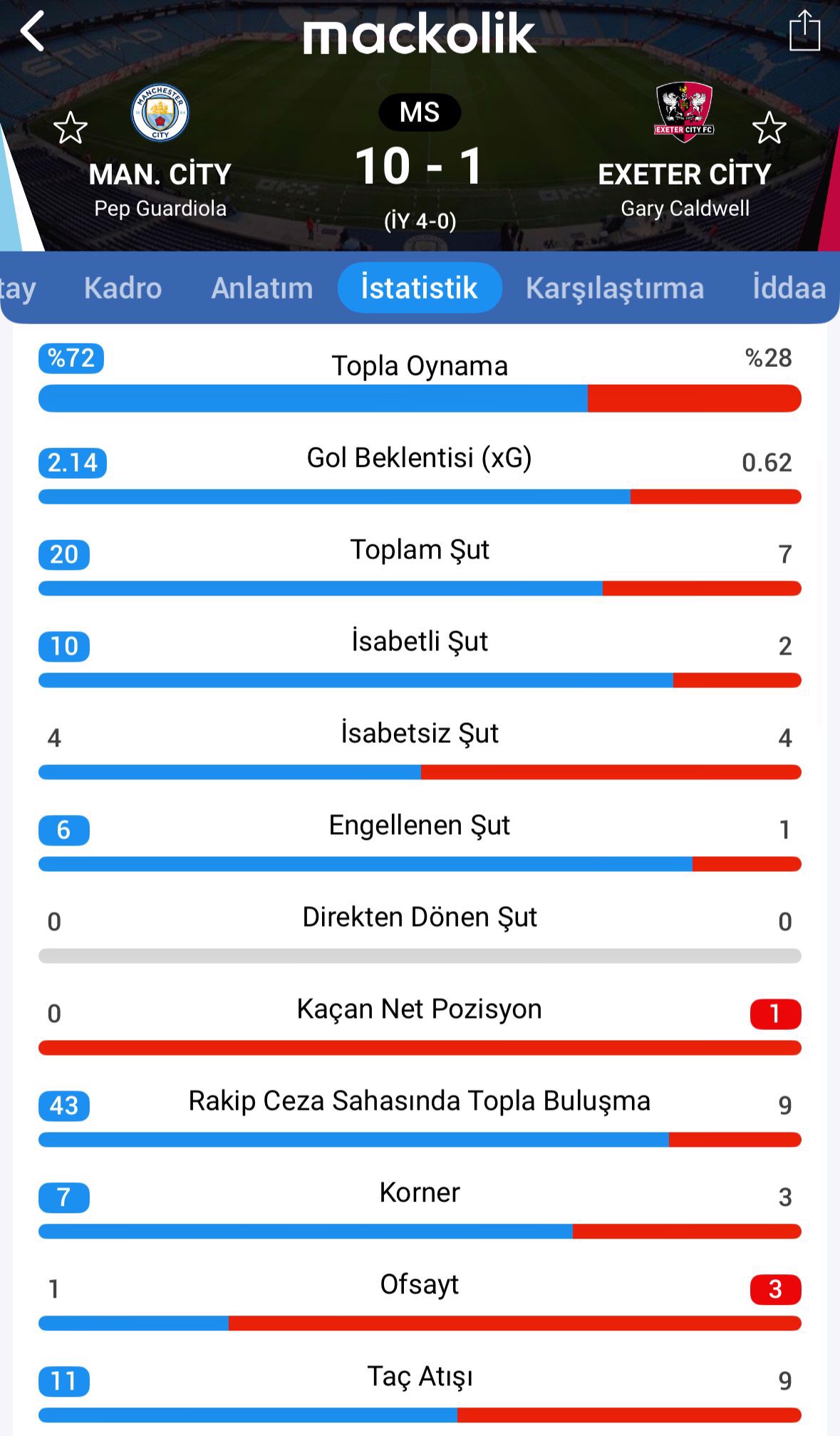 FA Cup 3. tur mücadelesinde Manchester City, İngiltere 1. Lig ekiplerinden Exeter City'yi konuk ettiği karşılaşmadan 10-1'lik skorla galip ayrıldı.