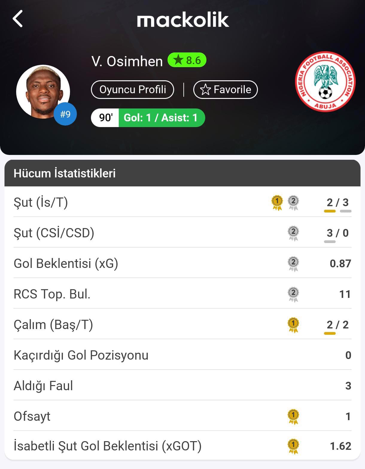 Maçta golleri Batı Afrika ekibi adına 47. dakikada Osimhen, 57. dakikada Adams kaydetti. Galatasaray'da forma giyen Osimhen, 2. golün asistini yaparak galibiyetin mimarı oldu.
