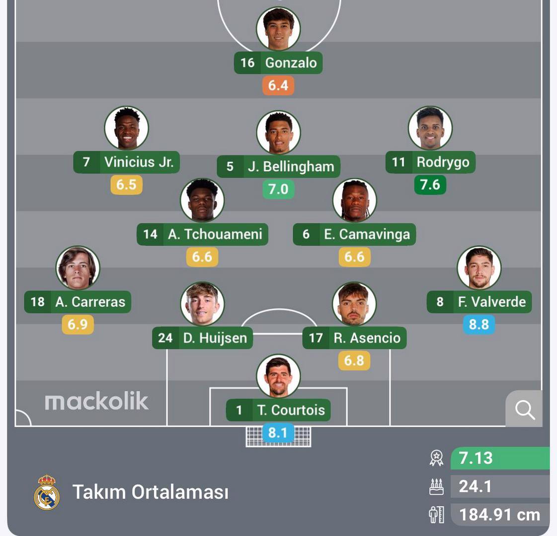 Real Madrid: Courtois, Valverde, Asencio, Huijsen, Carreras, Camavinga, Tchouameni, Rodrygo, Bellingham, Vinicius Jr. ,Gonzalo