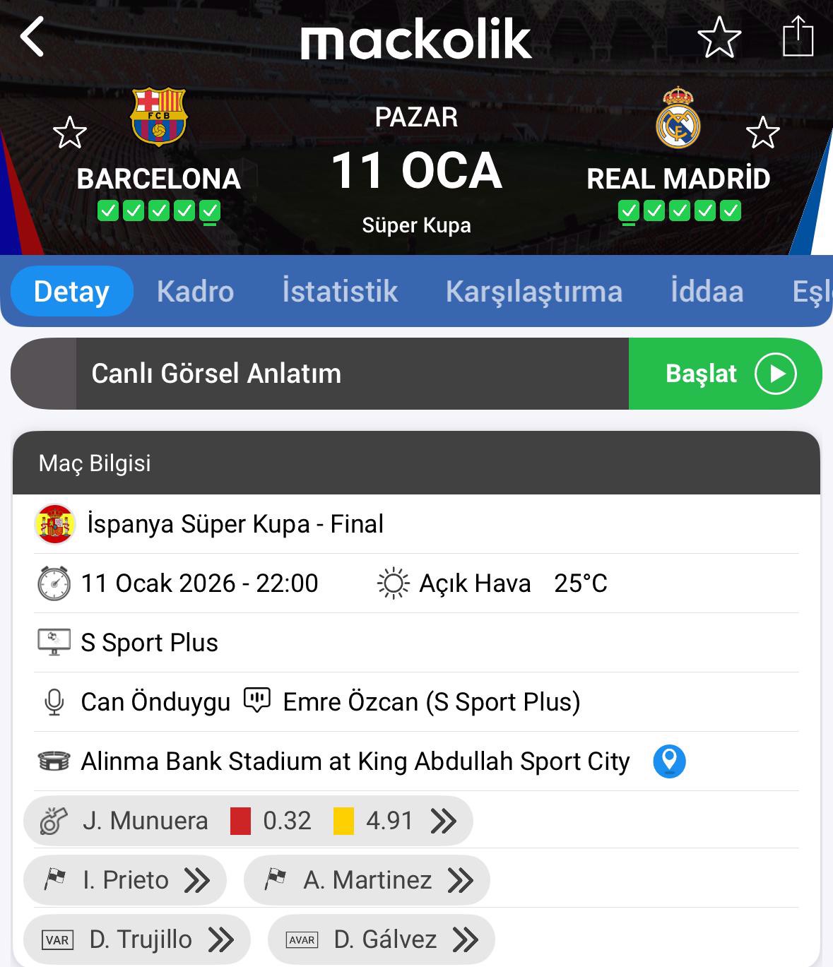 Alinma Bank Stadyumu'nda TSİ 22.00'de başlayacak olan maçı İspanyol hakem Jose Manuera yönetecek.