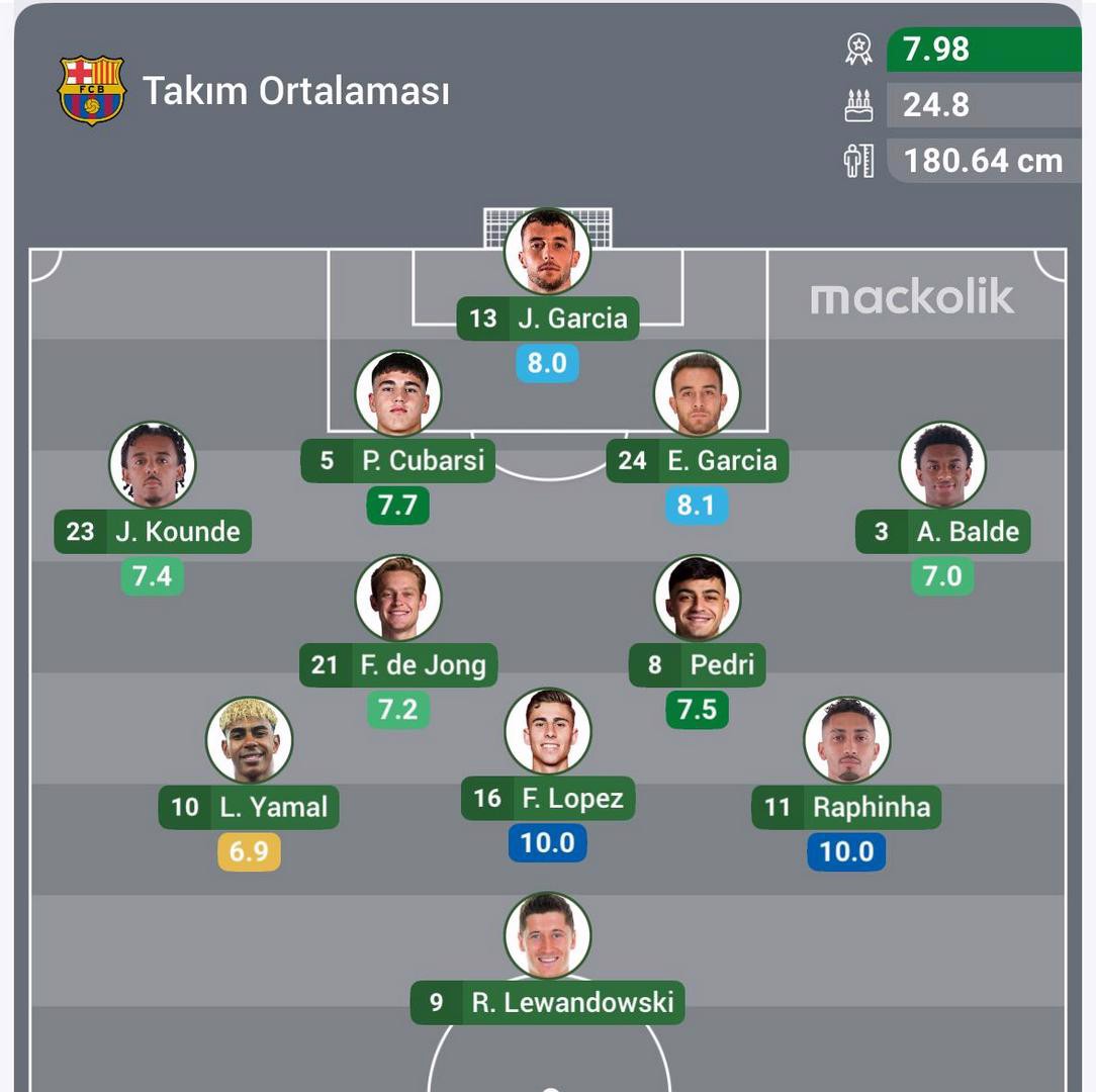 Barcelona: Garcia, Kounde, Cubarsi, Garcia, Balde, Frankie de Jong, Pedri, Yamal, Fermin, Raphinha, Lewandowski