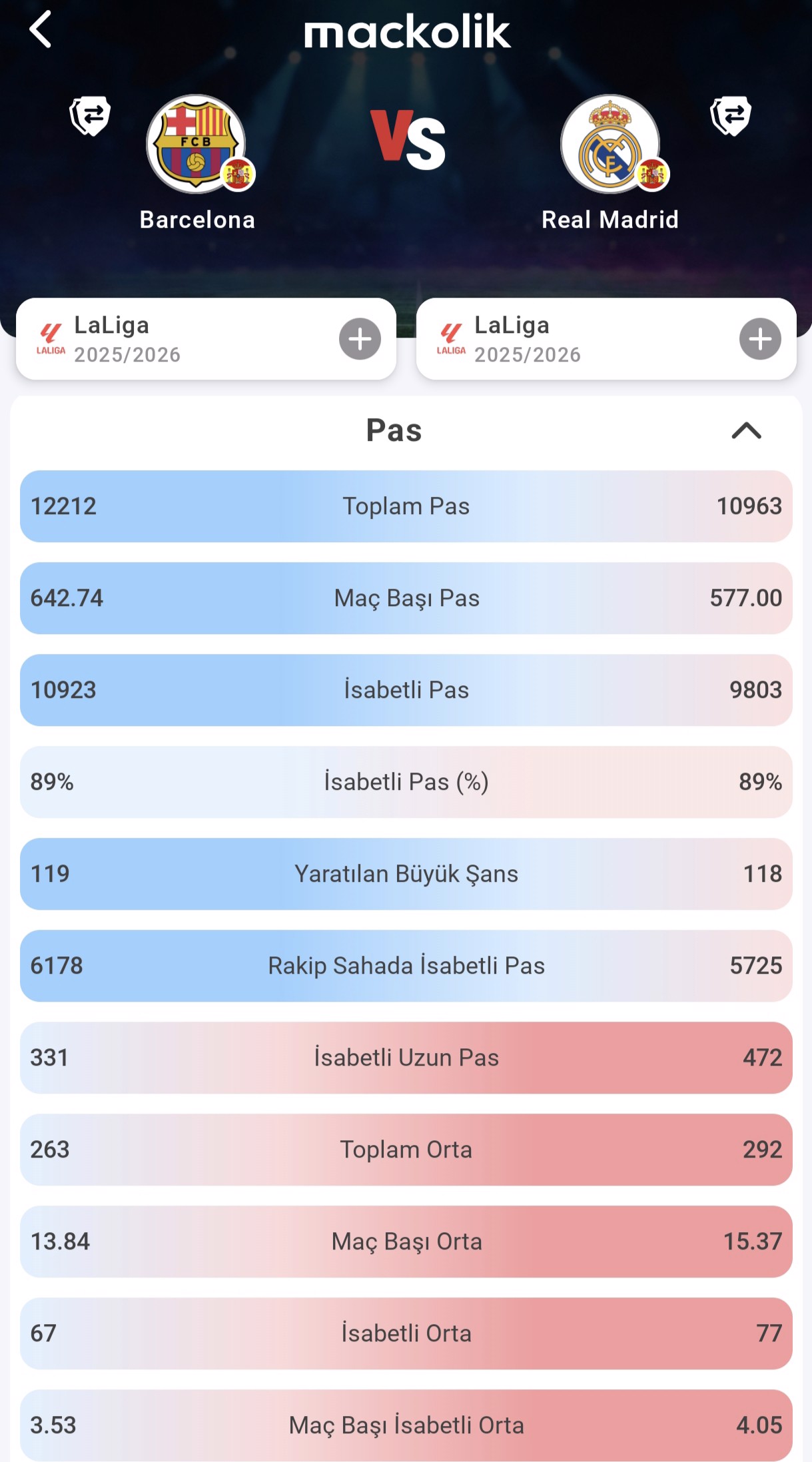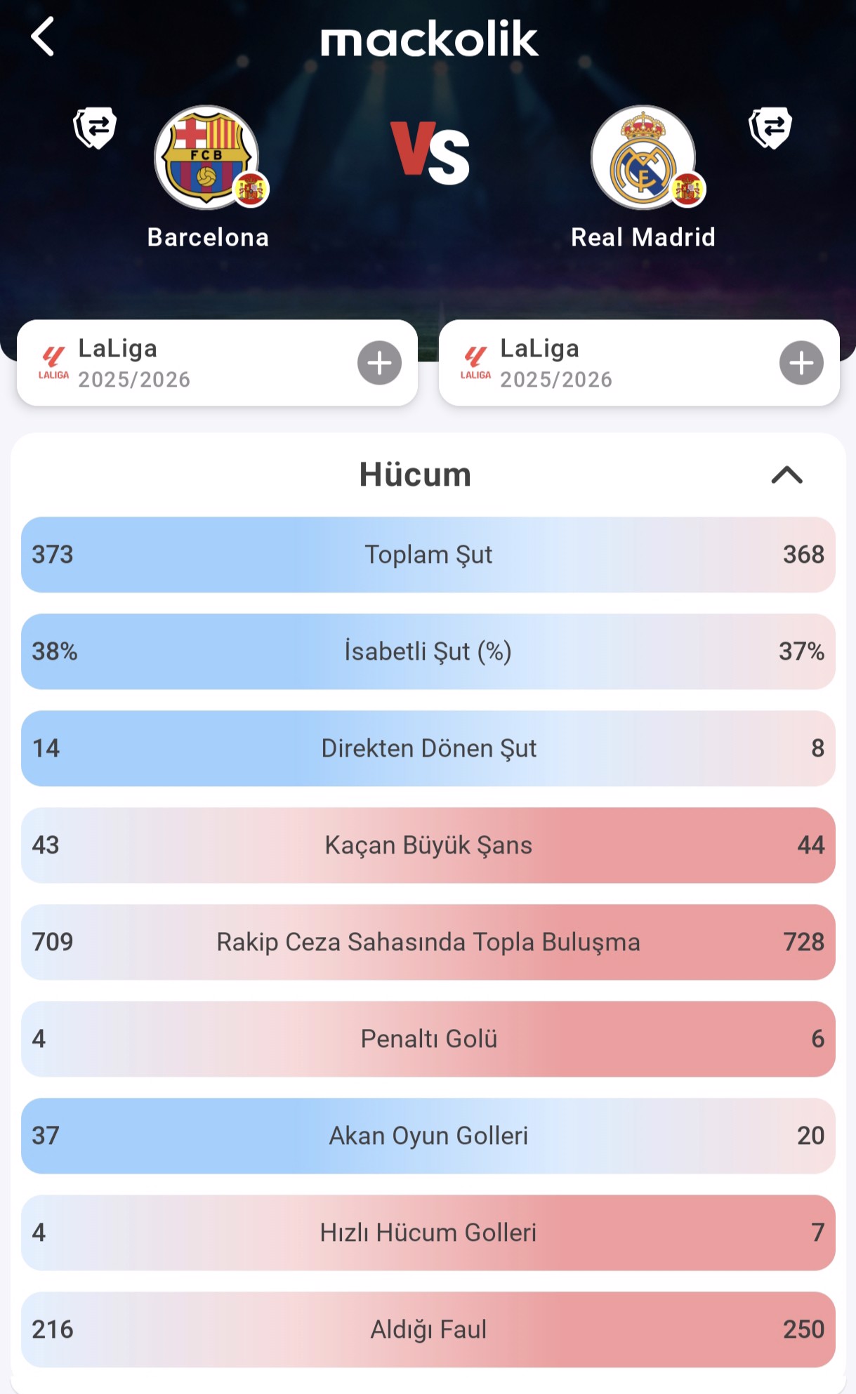 İspanya Süper Kupa finalinde Barcelona ile Real Madrid karşı karşıya gelecek. İki takımın bu sezon ligdeki istatistiklerini Mackolik'in 'Takım Karşılaştırma' özelliğiyle inceledik.