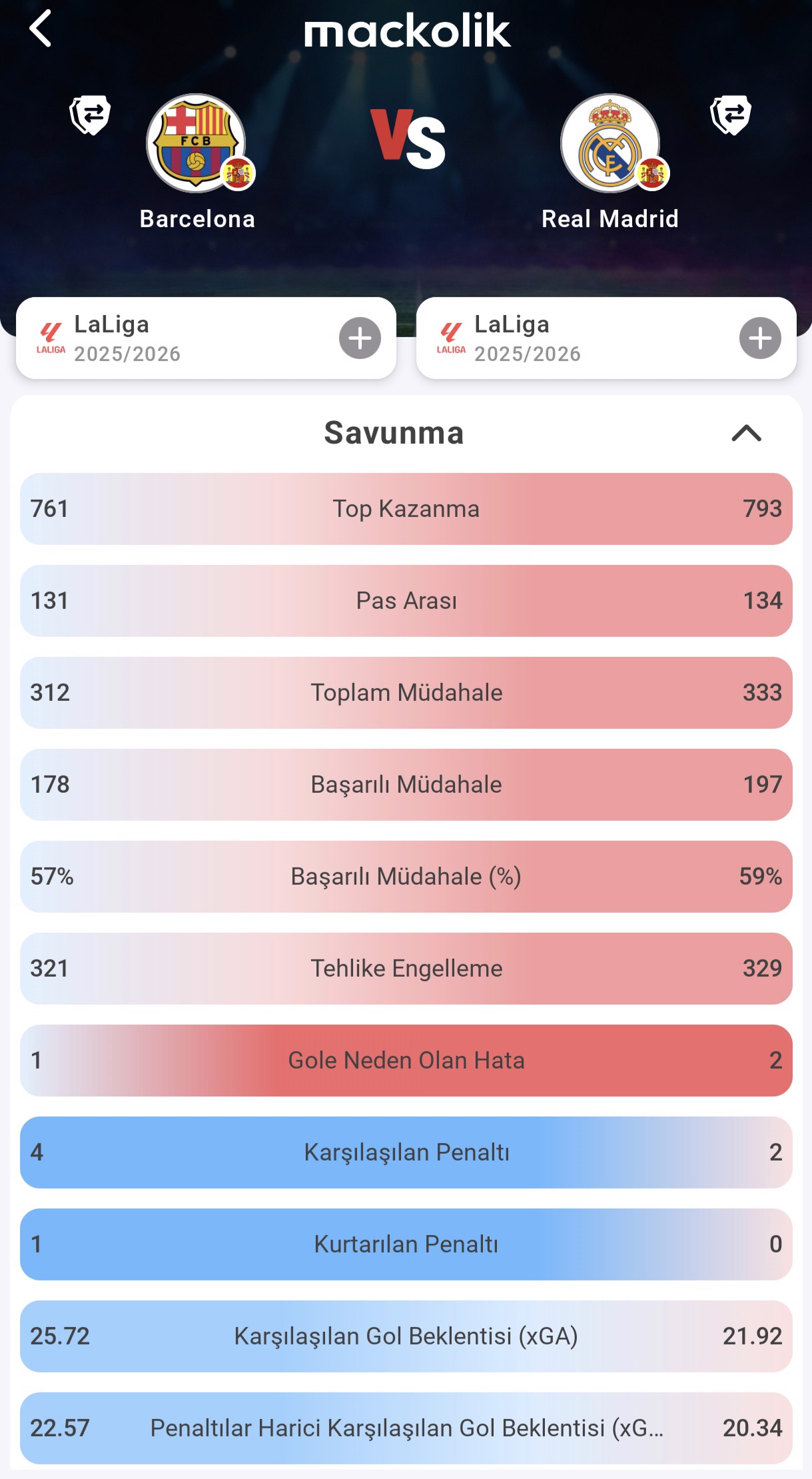Barcelona savunmada daha kontrollü ve pozisyon disiplinine dayalı bir yapı sergiliyor. 761 top kazanımı, %57'lik müdahale başarısı ve yalnızca 1 gole neden olan hata, risk almaktan kaçınan bir savunma anlayışını işaret ediyor. Ancak 25.72 xGA, bu yüksek savunma çizgisinin zaman zaman tehdit ürettiğini de gösteriyor. Katalan ekibinin son haftalarda kalesini gole kapaması, iyileşmenin sinyali olsa da bu yapının Mbappe'li bir Madrid karşısında sınanacağı açık.
