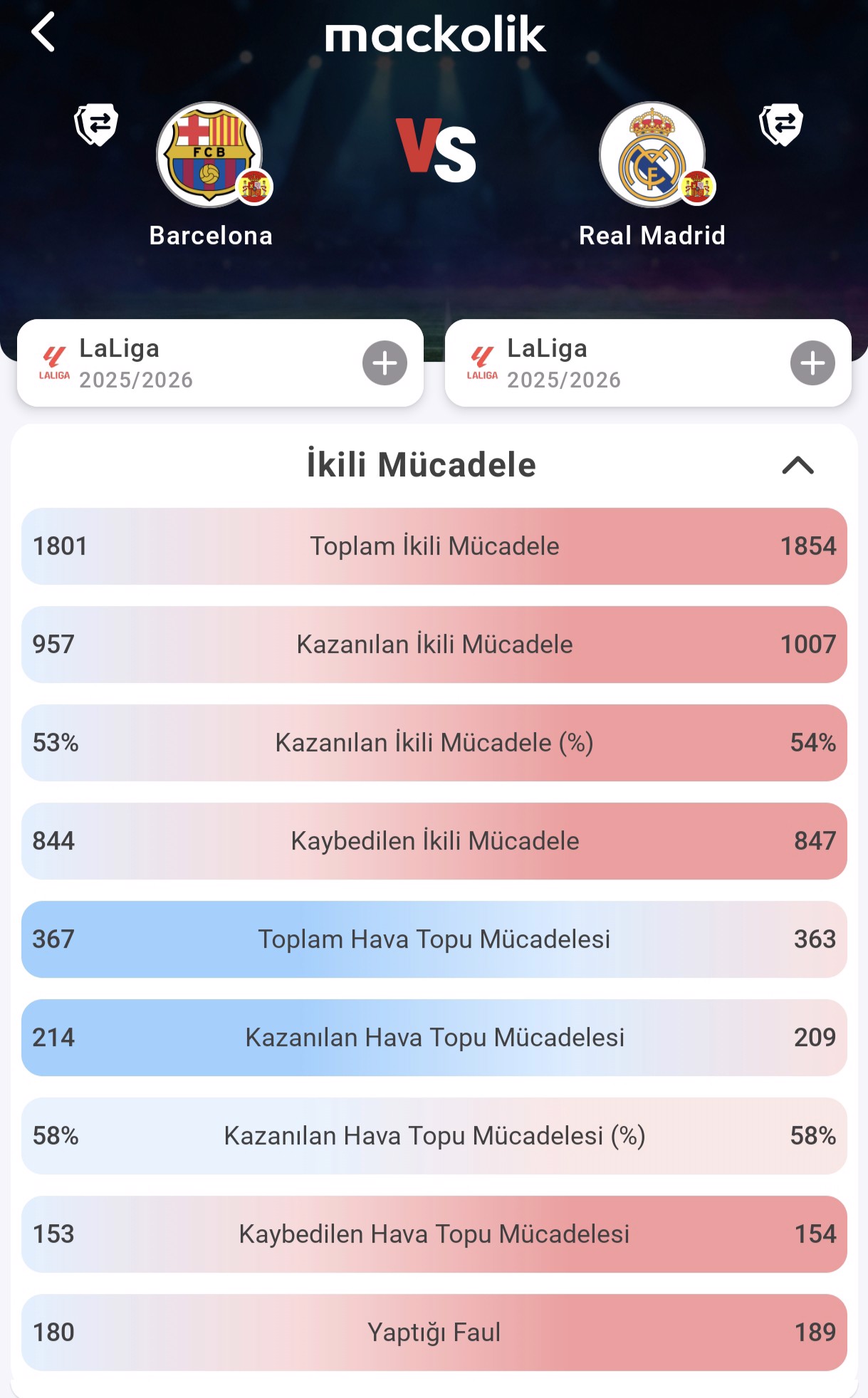 Barcelona, LaLiga'da ikili mücadelelerde dengeli ve alan kontrolüne dayalı bir profil sergiledi. 1.801 ikili mücadelenin 957'sini kazanarak %53'lük başarı oranı yakalayan Katalan ekibi, hava toplarında da %58'lik kazanma oranıyla istikrar sağladı. Daha az faul yapan Barcelona, temaslı oyunu dozunda tutup pozisyon disiplinini korumayı tercih eden bir yapı ortaya koydu.