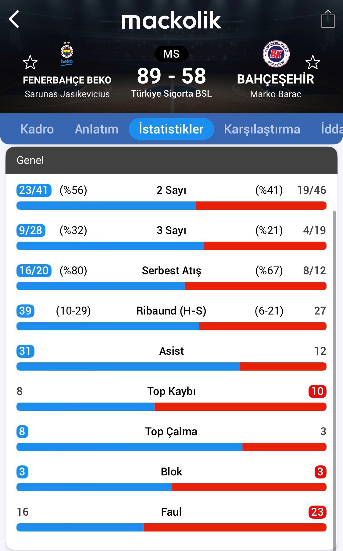 Mücadelenin ikinci yarısında da skor üstünlüğünü elinde tutmayı başaran ev sahibi ekip, Bahçeşehir'i 89-58 mağlup ederek ligdeki 13'üncü galibiyetini aldı. Marko Barac'ın öğrencileri ise sezonun 4'üncü mağlubiyetini yaşadı.