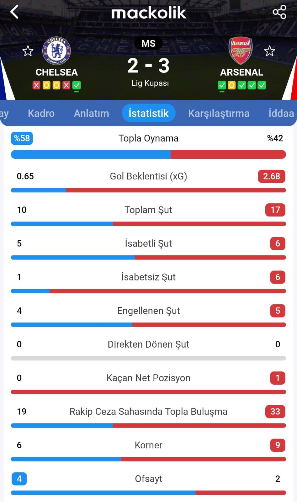 İlk yarı 1-0 Arsenal üstünlüğüyle sonuçlandı.