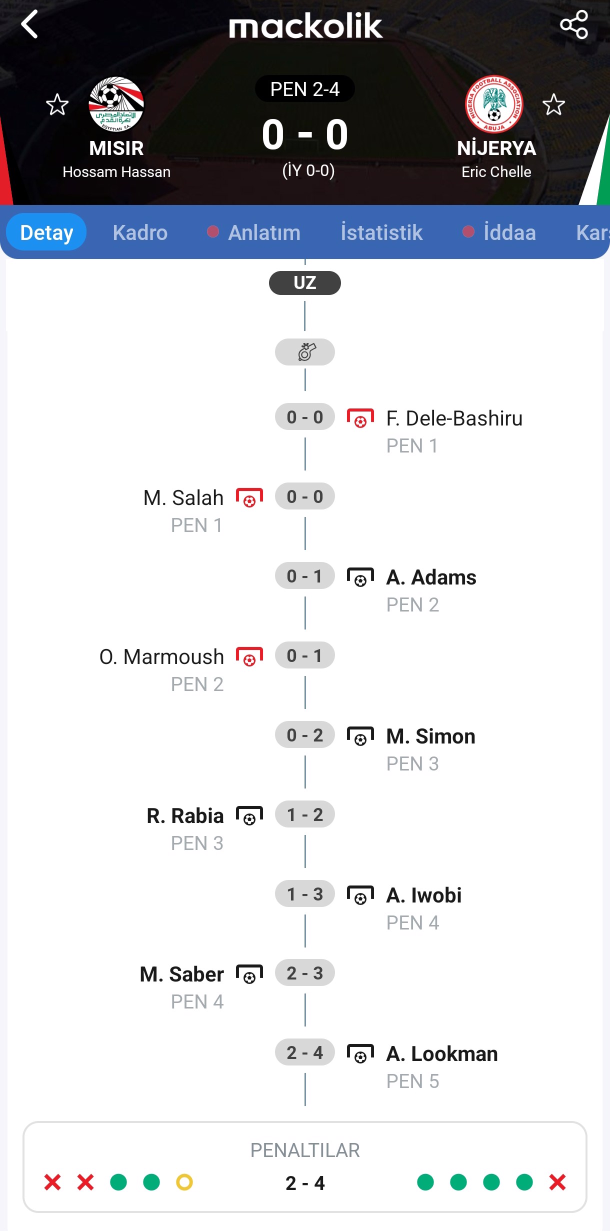Afrika Uluslar Kupası üçüncülük maçında Nijerya, Mısır'ı penaltılarda 4-2 mağlup etti. Mısır'da Salah takımının ilk penaltı atışından yararlanamadı.