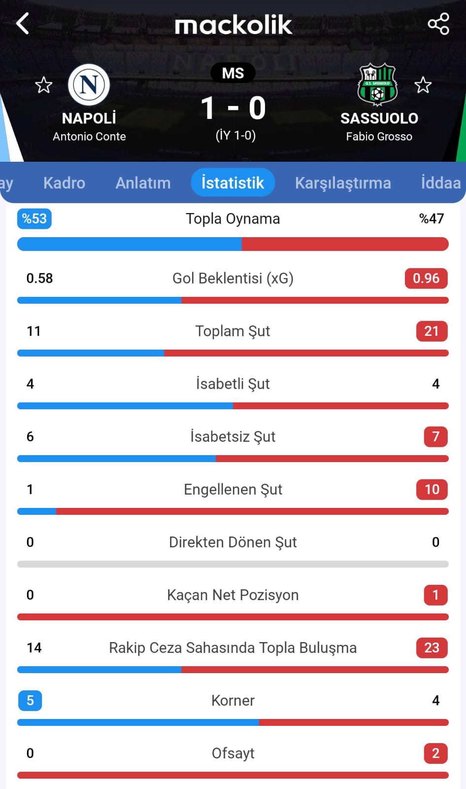 Karşılaşmanın tek golü 7. dakikada Stanislav Lobotka'dan geldi.