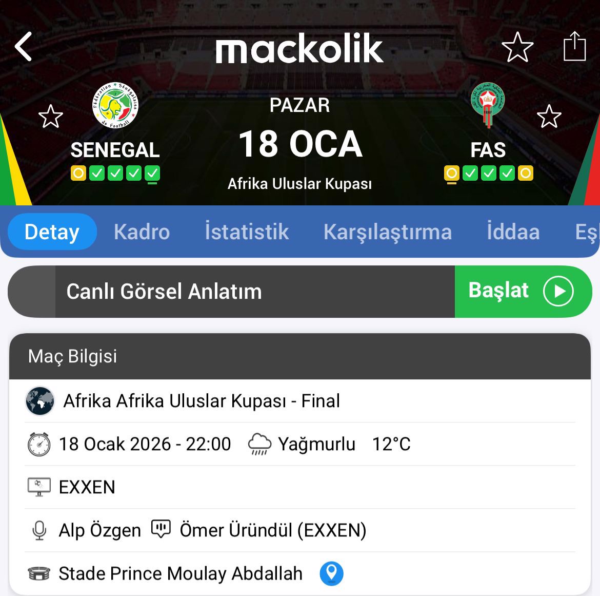 Başkent Rabat'taki 69 bin 500 kapasiteli Prens Moulay Abdellah Stadı'nda ev sahibi Fas ile Senegal arasında oynanacak final mücadelesi, TSİ 22.00'de başlayacak.