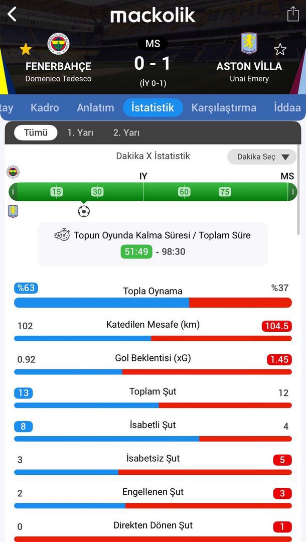 25. dakikada Aston Villa öne geçti. Sağ kanatta topla buluşan Rogers, ceza sahası içine ortaladı. İsmail Yüksek'in kafasından seken meşin yuvarlak arka direğe hareketlenen Sancho'nun önünde kaldı. Bu futbolcu kafayla topu filelere gönderdi: 0-1.