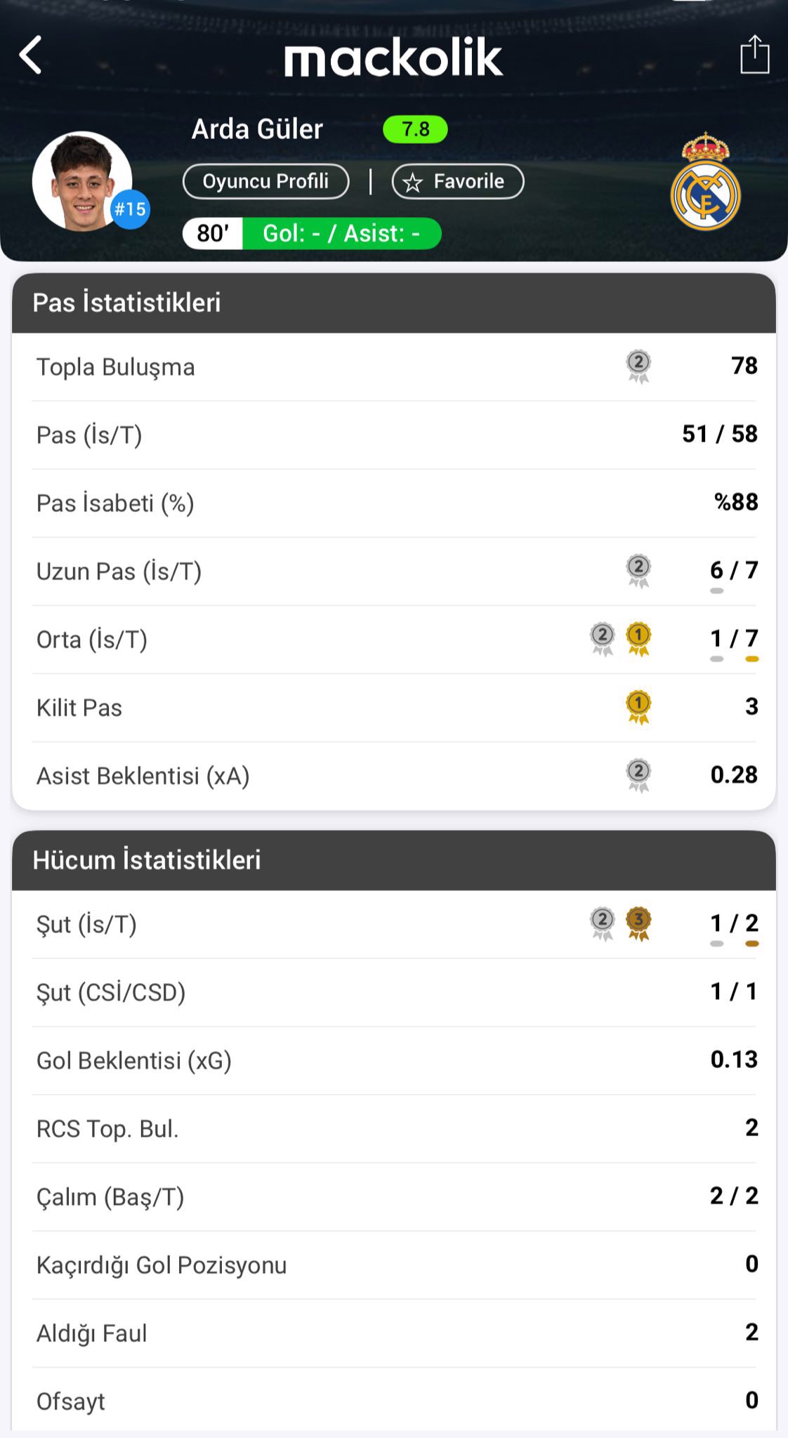 3 kilit pas atan Arda, 0.28 asist beklentisiyle karşılaşmayı tamamladı.