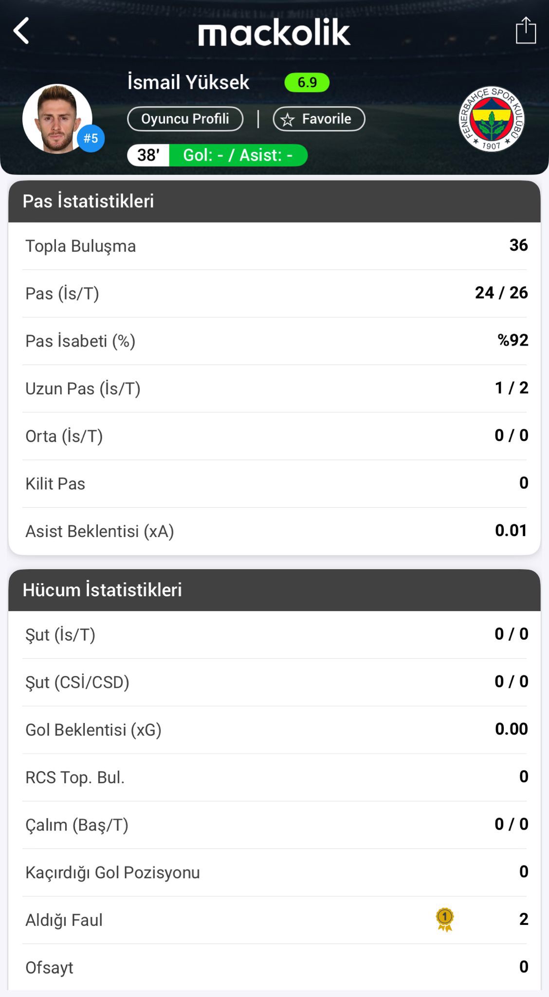 Fenerbahçe'de milli oyuncu İsmail Yüksek sakatlanarak oyuna devam edemedi.