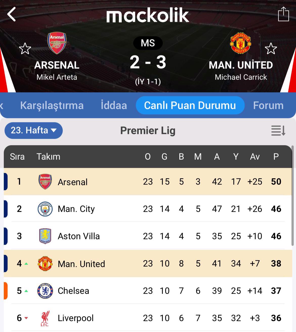 Premier Lig'de Manchester United deplasmanda lider Arsenal'ı 3-2 mağlup etti. Kırmızı Şeytanlar, Michael Carrick yönetiminde üst üste ikinci dev galibiyetini aldı. Öte yandan Arsenal, bu sezonki ilk iç saha mağlubiyetini yaşadı.