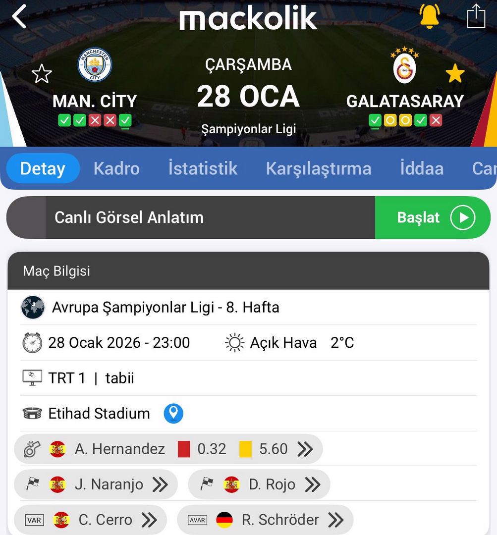 Galatasaray, Şampiyonlar Ligi'nde lig aşamasının son maçında Manchester City'ye konuk olacak. Saat 23.00'te başlayacak maçı, İspanyol hakem Alejandro Hernandez yönetecek.