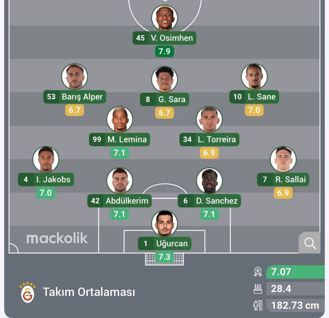 Galatasaray: Uğurcan Çakır, Sallai, Sanchez, Abdülkerim Bardakcı, Jakobs, Torreira, Lemina, Sane, Sara, Barış Alper Yılmaz, Osimhen