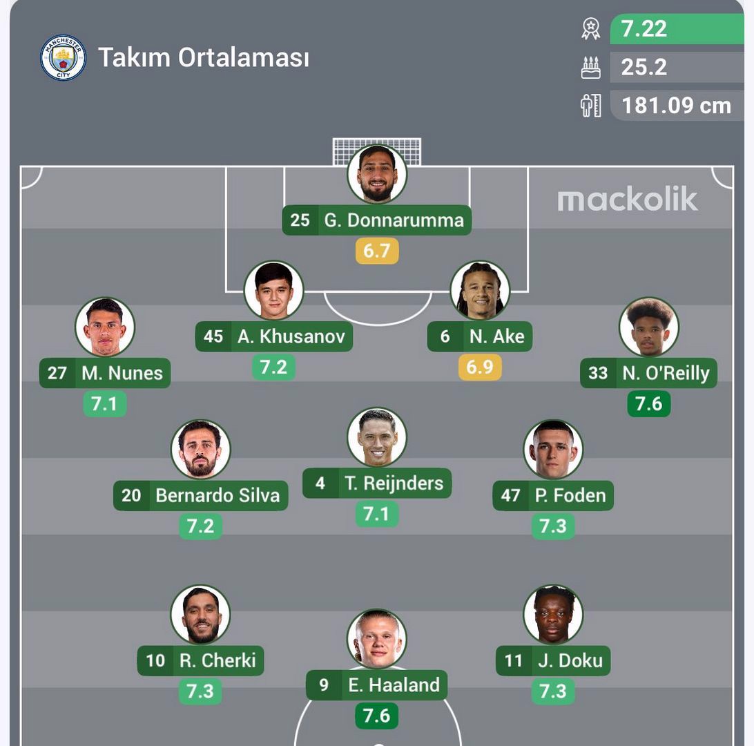 Manchester City: Donnarumma, Nunes, Khusanov, Ake, O'Reilly, Bernardo Silva, Reijnders, Foden, Cherki, Doku, Haaland