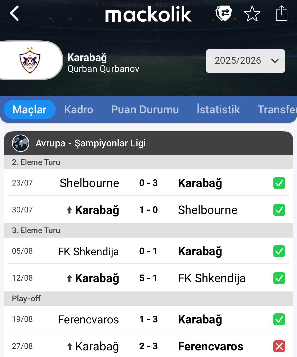 Geçtiğimiz sezon Azerbaycan Premier Ligi'ni 89 puanla şampiyon olarak tamamlayan Karabağ, Şampiyonlar Ligi serüvenine 2. eleme turundan başladı.