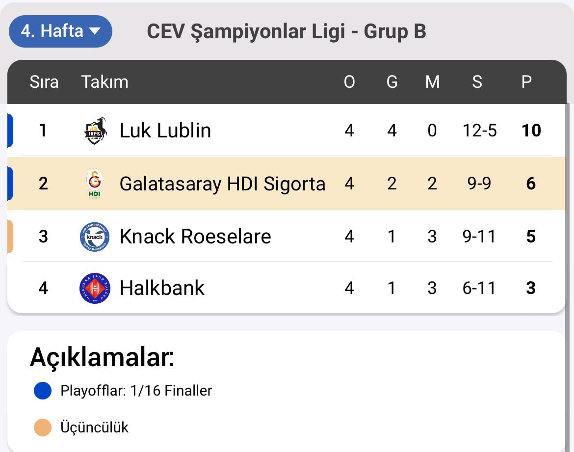 Temsilcilerimiz Galatasaray HDI Sigorta ile Halkbank'ı karşı karşıya getiren CEV Erkekler Şampiyonlar Ligi B Grubu 4. maçında kazanan 3-1'lik sonuçla sarı-kırmızılı takım oldu.