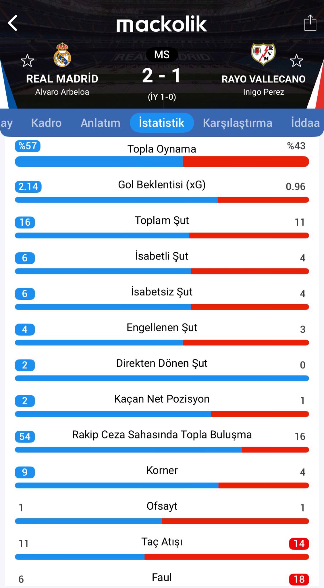 Bu sonuçla birlikte Real Madrid puanını 54'e yükseltti. Rayo Vallecano ise 22 paunda kaldı.