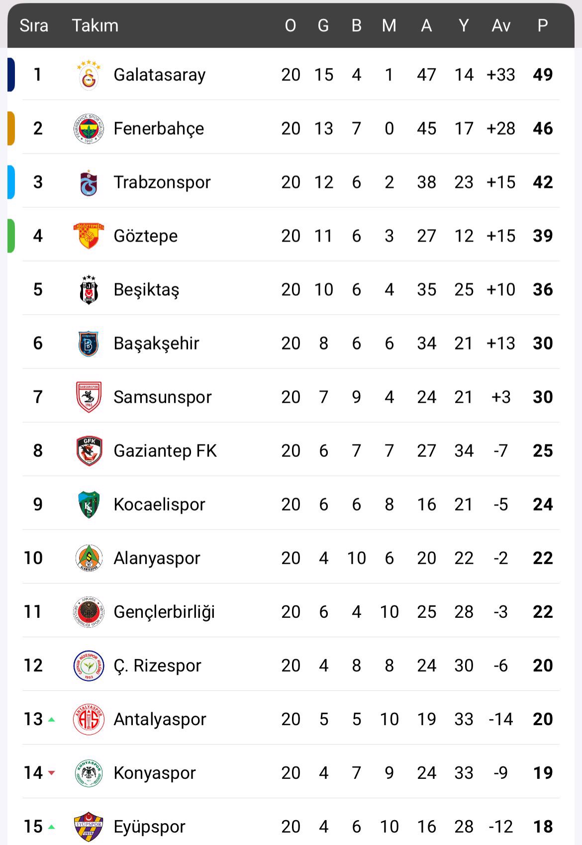 Antalyaspor ile deplasmanda 1-1 berabere kalan Trabzonspor 42 puanla üçüncü, Fatih Karagümrük'ü evinde 2-1 mağlup eden Göztepe 39 puanla dördüncü, Konyaspor'u sahasında 2-1 yenen Beşiktaş ise 36 puanla haftayı beşinci sırada tamamladılar.