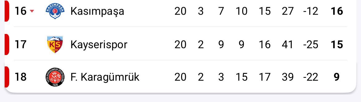 16'ncı sıradaki Kasımpaşa'nın 16, 17'nci sıradaki Kayserispor'un 15, 18'inci ve son sıradaki Fatih Karagümrük'ün ise 9 puanı bulunuyor.