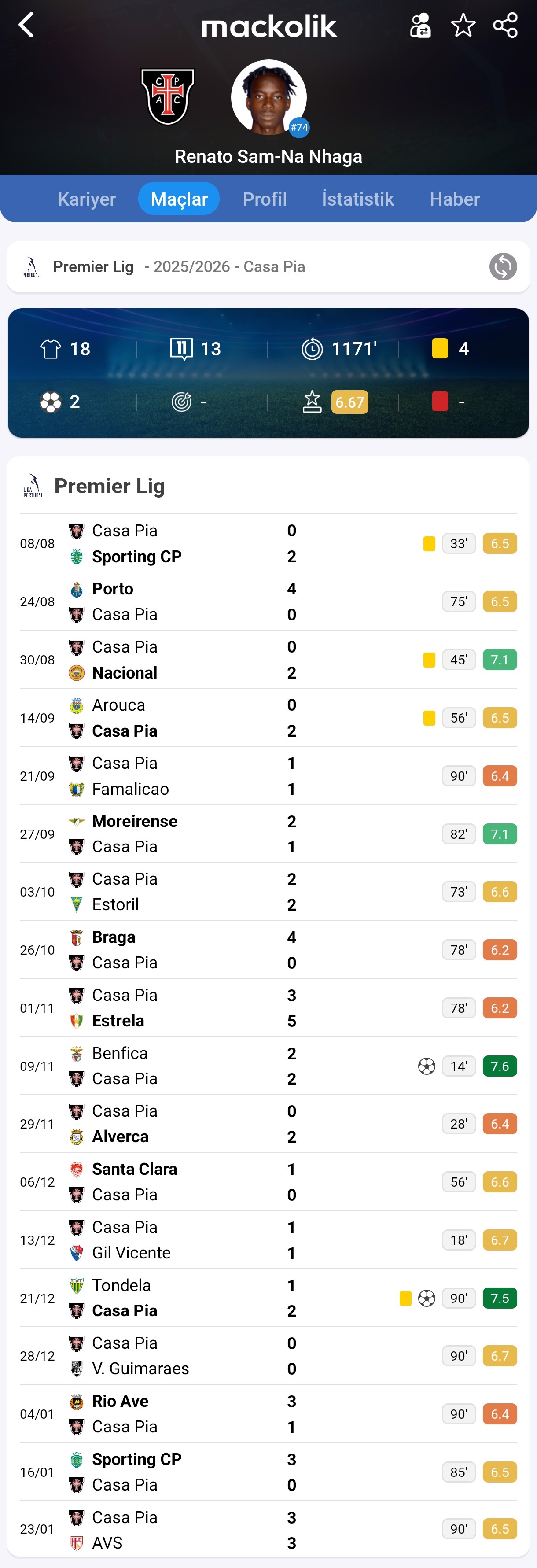 Casa Pia'da profesyonel olan Nhaga, Portekiz ekibiyle bu sezon 21 maça çıktı.
