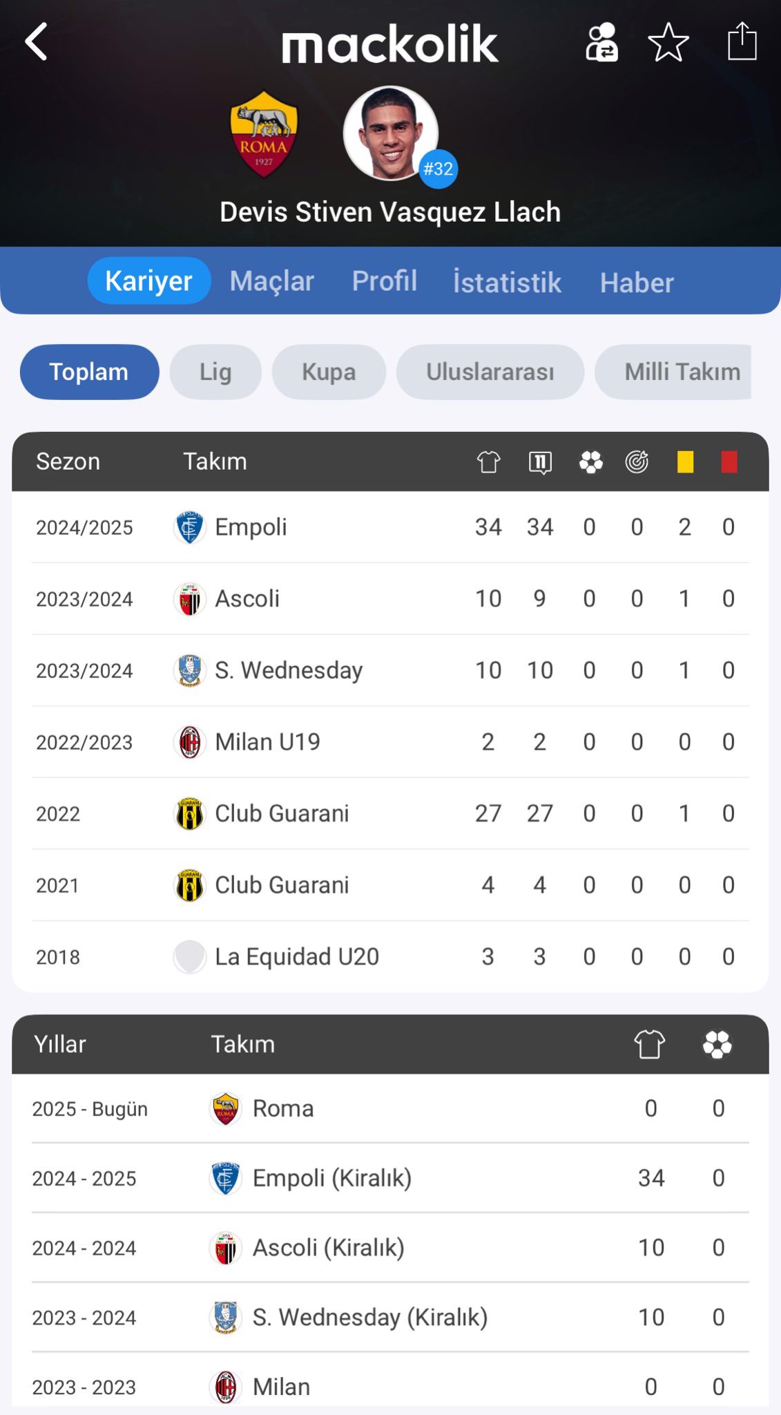 Empoli'den kiralık olarak Milan'a geri dönen Vasquez, ardından Roma'yla bedelsiz olarak anlaştı.