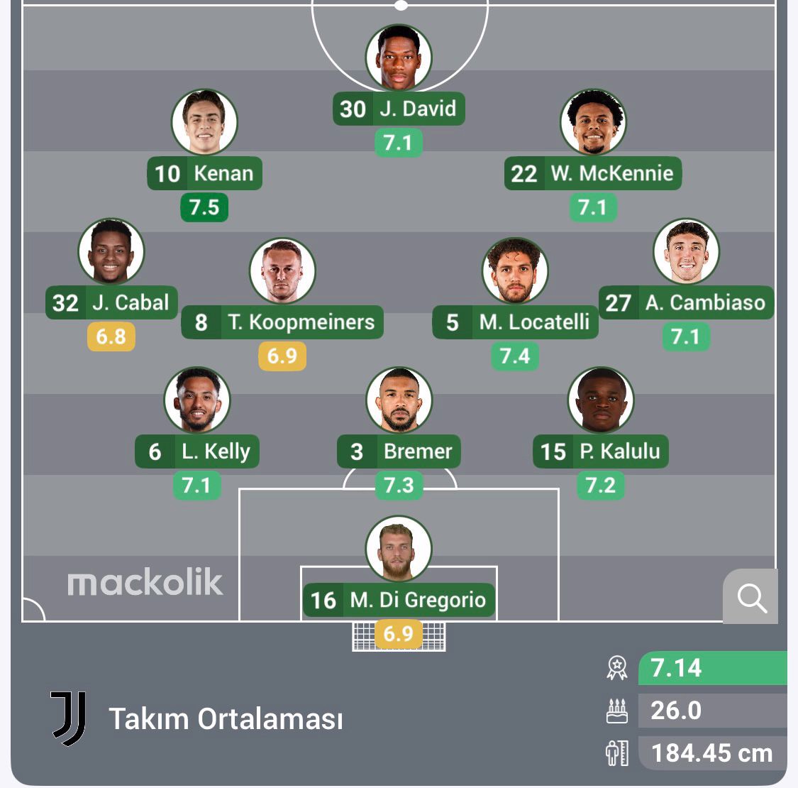 Juventus: Di Gregorio, Kelly, Bremer, Kalulu, Cabal, Koopmeiners, Locatelli, Cambiaso, Kenan Yıldız, McKennie, David