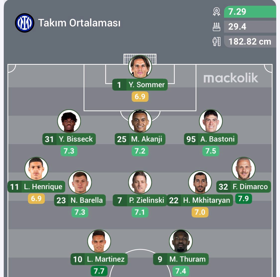 Inter: Sommer, Bisseck, Akanji, Bastoni, Henrique, Barella, Zielinski, Mkhitaryan, Dimarco, Martinez, Thuram