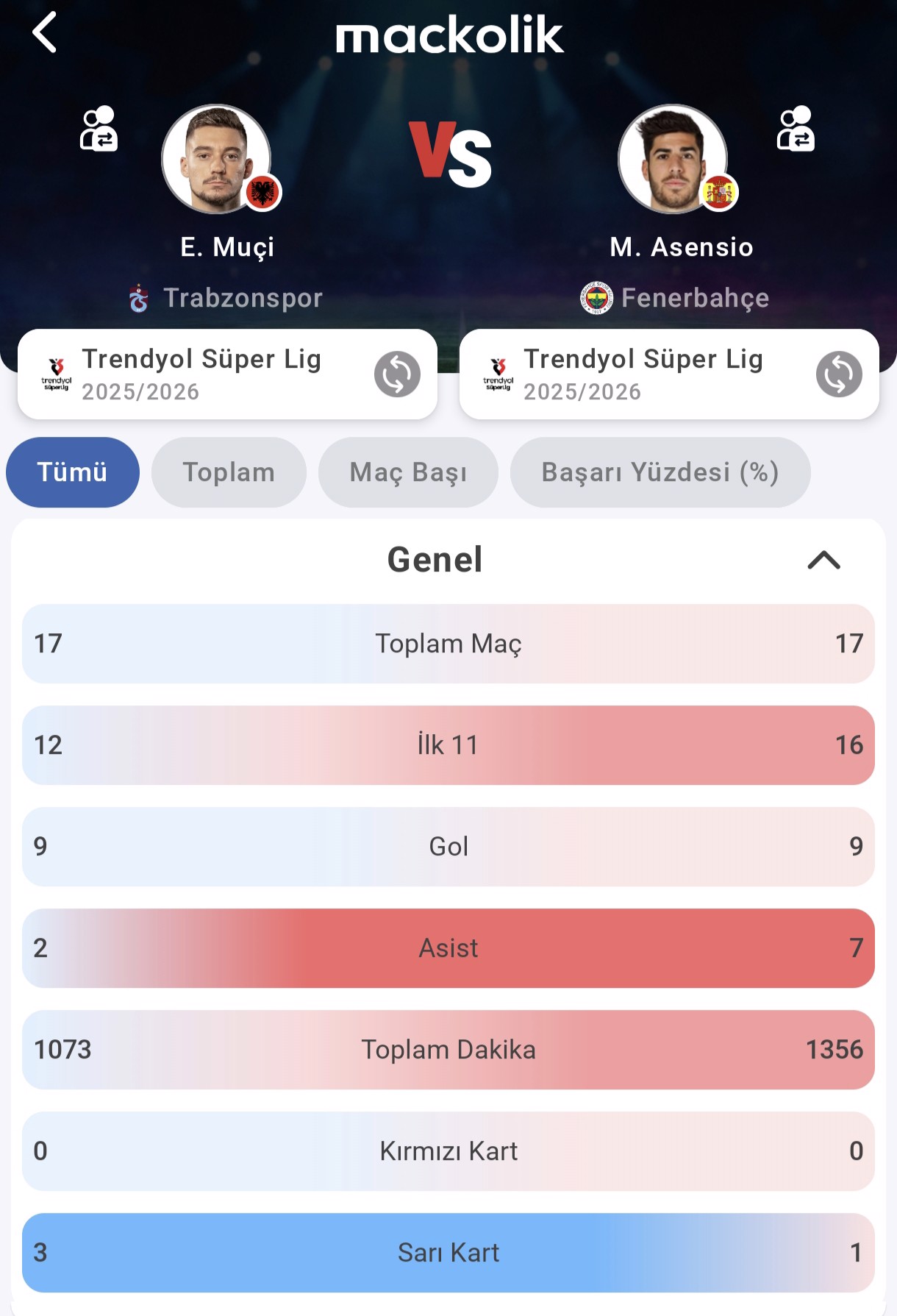 İki oyuncu da ligde 17 maçta forma giydi ancak ilk 11 başlangıcında Asensio (16) Muçi'nin (12) önünde. Süre tarafında da Fenerbahçeli oyuncu 1356 dakika ile daha fazla sahada kaldı; Muçi 1073 dakikada görev yaptı.