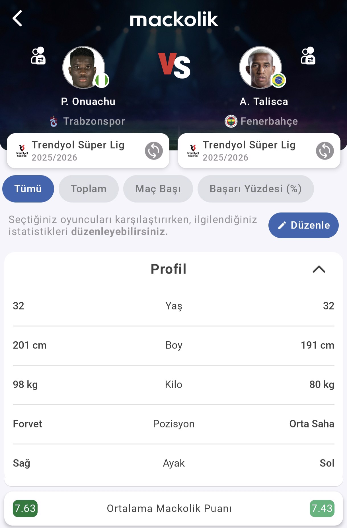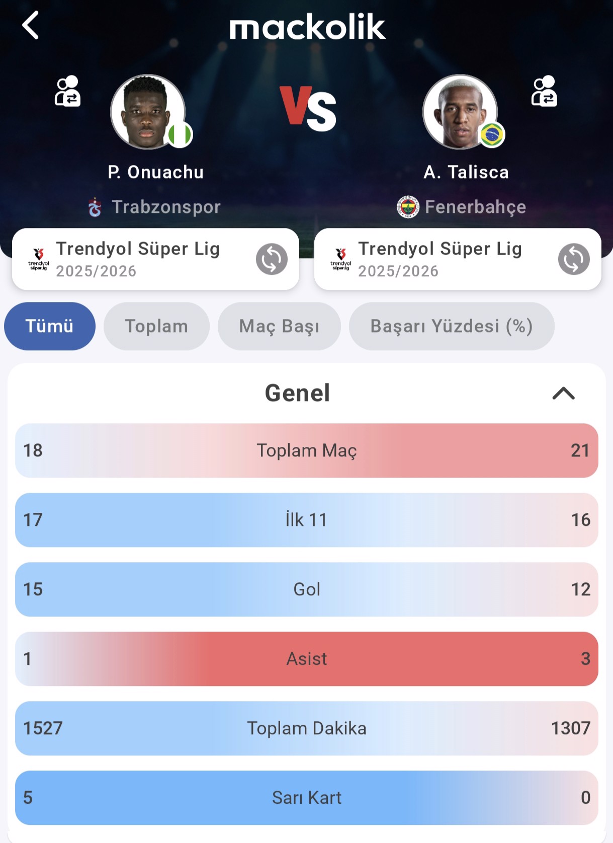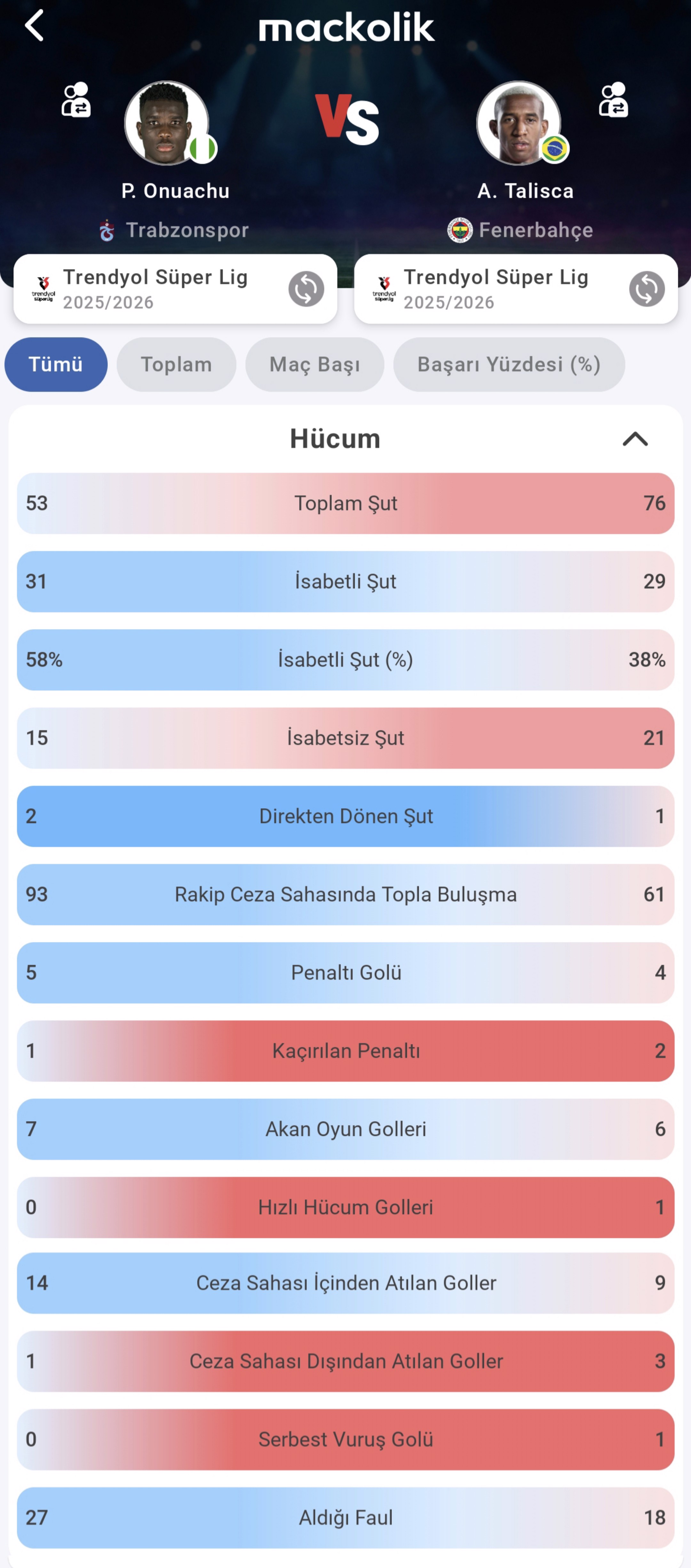 Genel tablo, Nijeryalı golcünün ceza sahası içi bitiricilik ve fiziksel baskı üzerinden fark yarattığını; Talisca'nın ise oyun içinde daha serbest dolaşarak skor ve asist katkısını birlikte sunduğunu ortaya koyuyor.
