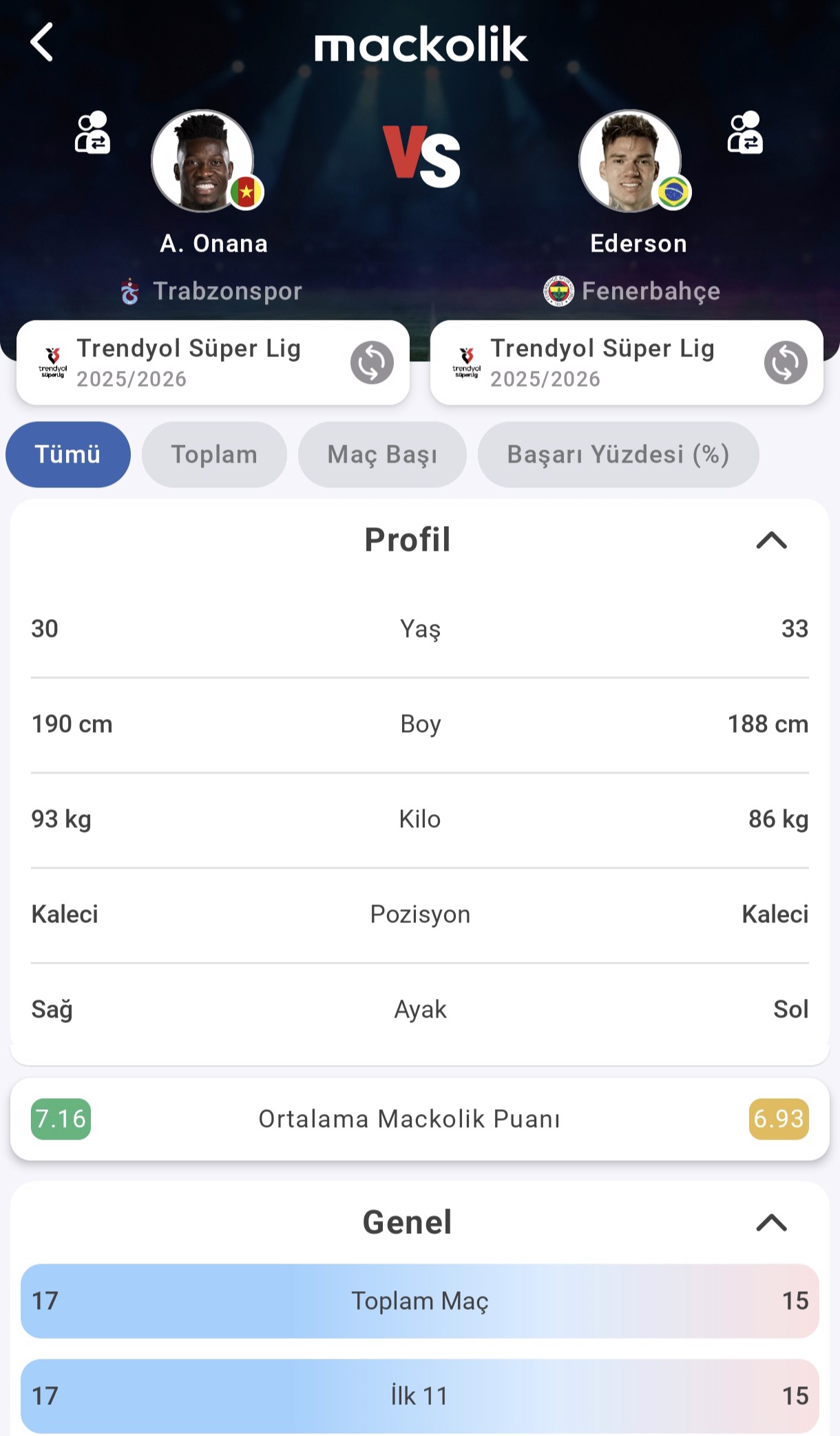 Ederson ise 15 maçta görev aldı ve 6.93 ortalamada kaldı. Reyting farkı, bireysel performans açısından Trabzonspor kalecisinin sezon genelinde daha öne çıktığını gösteriyor.