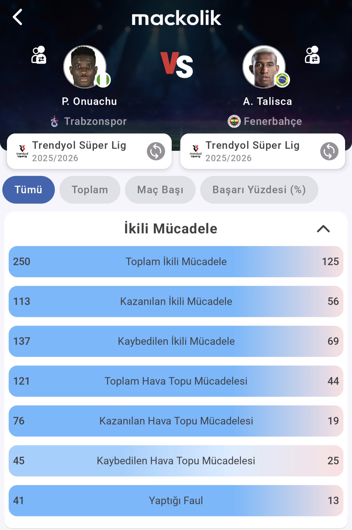 Faul sayıları da tabloyu tamamlıyor: Onuachu 41 faulle daha sert ve temaslı bir profil çizerken, Talisca 13 faulde kalmış. Bu eşleşme, fiziksel baskı ile teknik hareketlilik arasındaki farkı net biçimde yansıtıyor. Derbide ceza sahası içi hava topları Onuachu'nun, ikinci toplar ve seken pozisyonlar ise Talisca'nın etki alanı olabilir.
