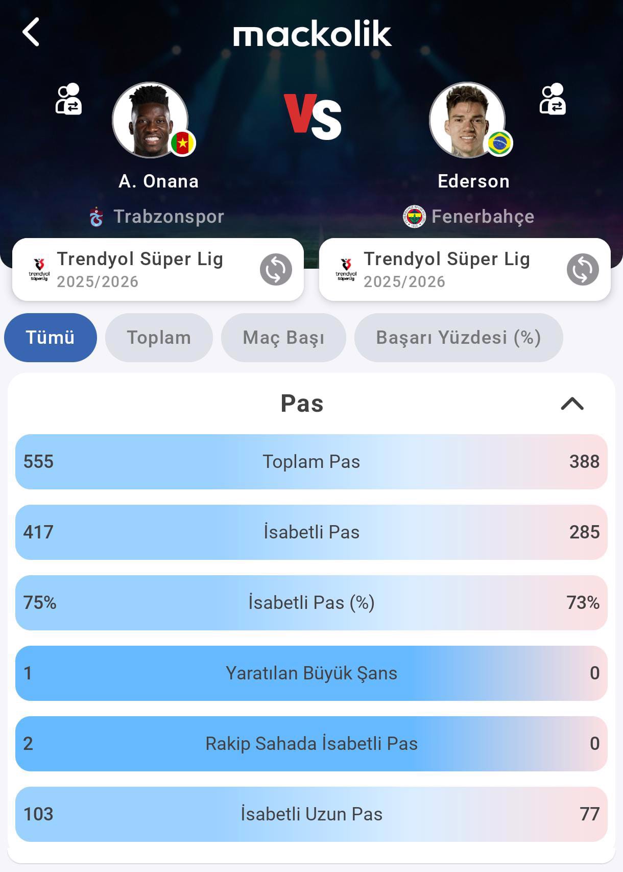 Onana 555 toplam pas ve 417 isabetli pasla oyun kurulumunda daha fazla sorumluluk aldı. %75 pas isabeti ve 103 isabetli uzun pas, Trabzonspor'un geriden çıkışlarında aktif rol oynadığını gösteriyor.