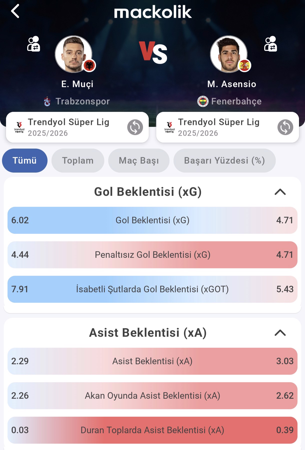 Uzun pas ve orta hacminde de Asensio daha geniş bir etki alanına sahip. 18 isabetli uzun pas ve 71 orta denemesi, hücumu farklı kanallardan beslediğini gösteriyor. Muçi daha dar alanda ve son dokunuş öncesi aksiyonlarda belirleyici olurken, Asensio oyunun ritmini kuran ve hücum organizasyonunu besleyen oyuncu profilinde.