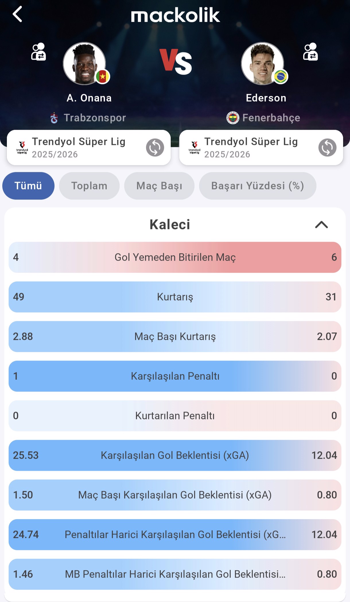 Mackolik'in "Oyuncu Karşılaştırma" özelliğiyle iki takımın kalecilerini ve hücum tehditlerini karşılaştırdık.