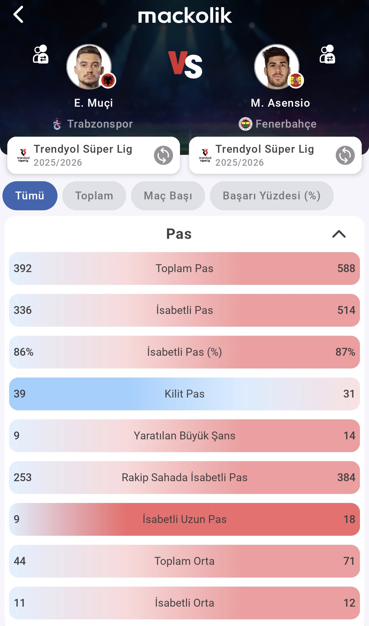Muçi ise daha dikine ve riskli tercihlerle öne çıkıyor. 39 kilit pas, onun savunma arkasını zorlayan bir oyun karakterine sahip olduğunu kanıtlıyor. Ancak yaratılan büyük şans sayısında Asensio (14), Arnavut oyuncunun (9) önüne geçerek final pas kalitesinde fark yaratıyor.