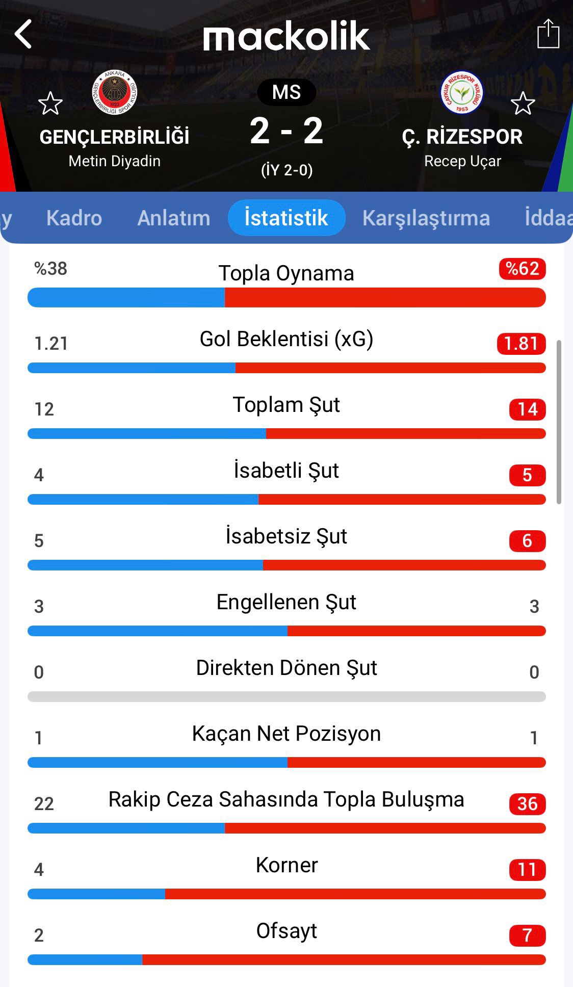 Süper Lig'in 22. haftasında Natura Dünyası Gençlerbirliği, sahasında Çaykur Rizespor ile 2-2 berabere kaldı. Konuk ekipte Mithat Pala, attığı 2 golle maça damgasını vurdu.