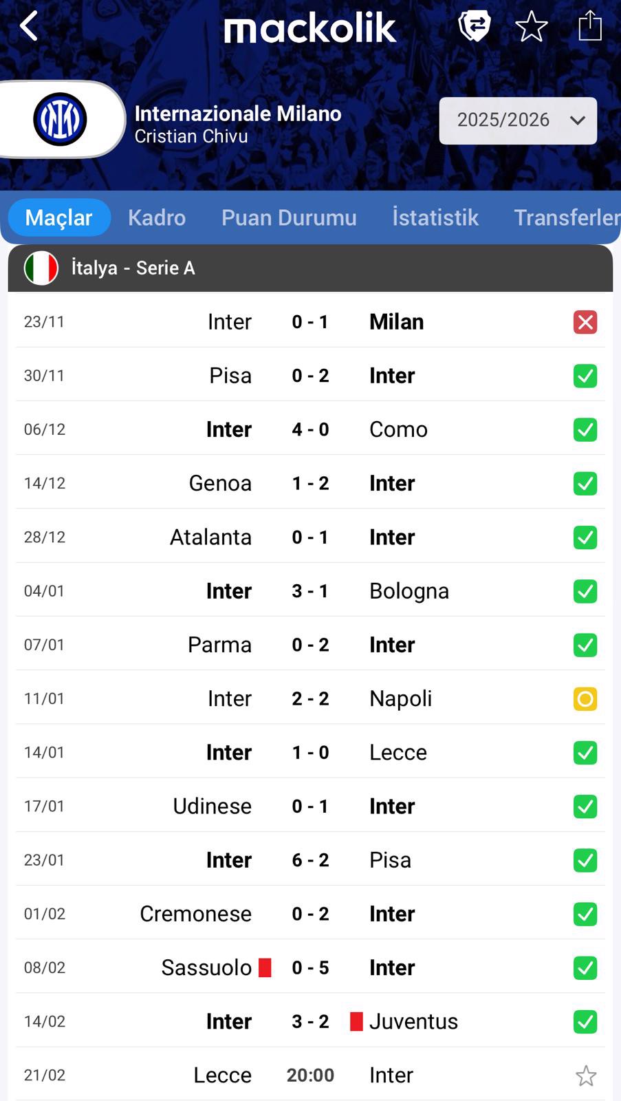Serie A'nın 2025-26 sezonuna liderlik koltuğunda tam gaz devam eden Inter, son 13 maçında mağlubiyet yüzü görmedi.