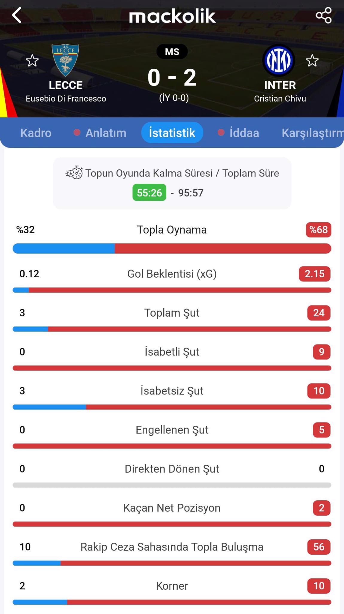 Karşılaşmada başka gol olmadı ve Inter deplasmanda Lecce'yi 2-0 mağlup etti.
