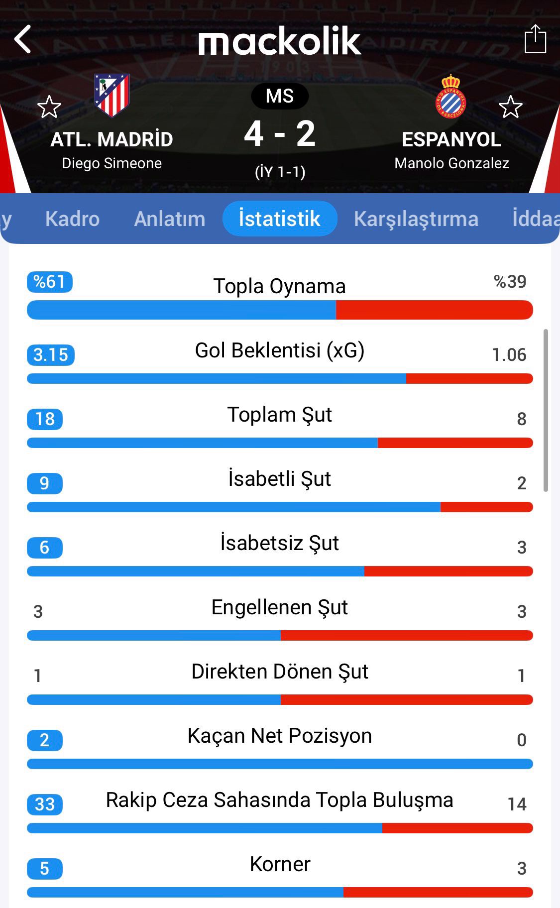 Karşılaşmada son gol 80. dakikada Espanyol'dan Edu Exposito ile geldi. 90 dakika, Atletico Madrid'in 4-2'lik galibiyetiyle sonuçlandı.