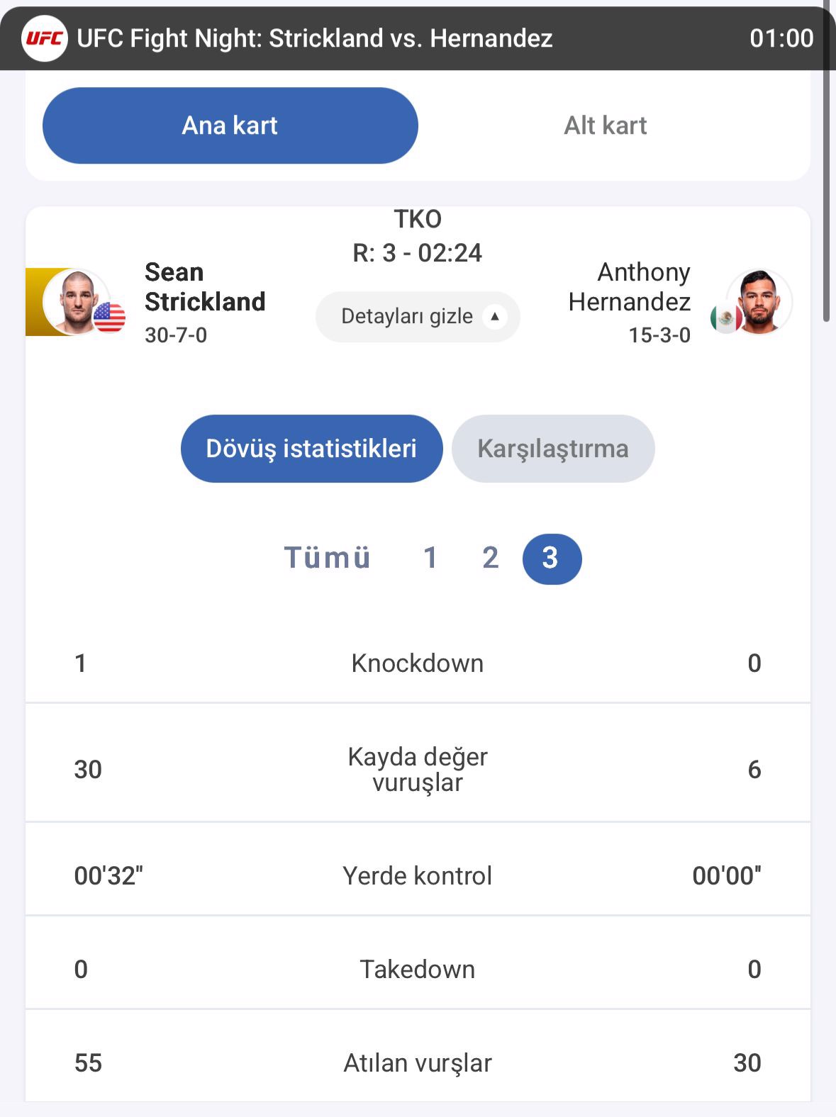 5 rauntluk ana maçta Sean Strickland ilmek ilmek işlediği 3. rauntluk oyununda bulduğu vuruşlarla Anthony Hernandez'i 3. raunt sonunda bitirdi.