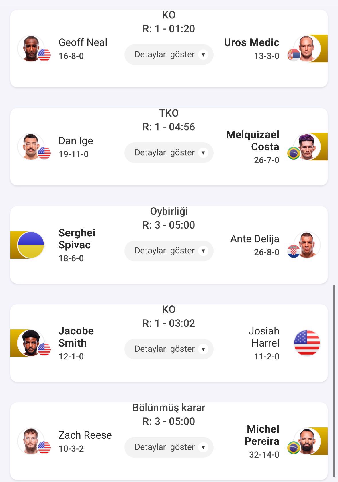 UFC Fight Night etkinliğinde ana kartta diğer sonuçlar ise şu şekilde;