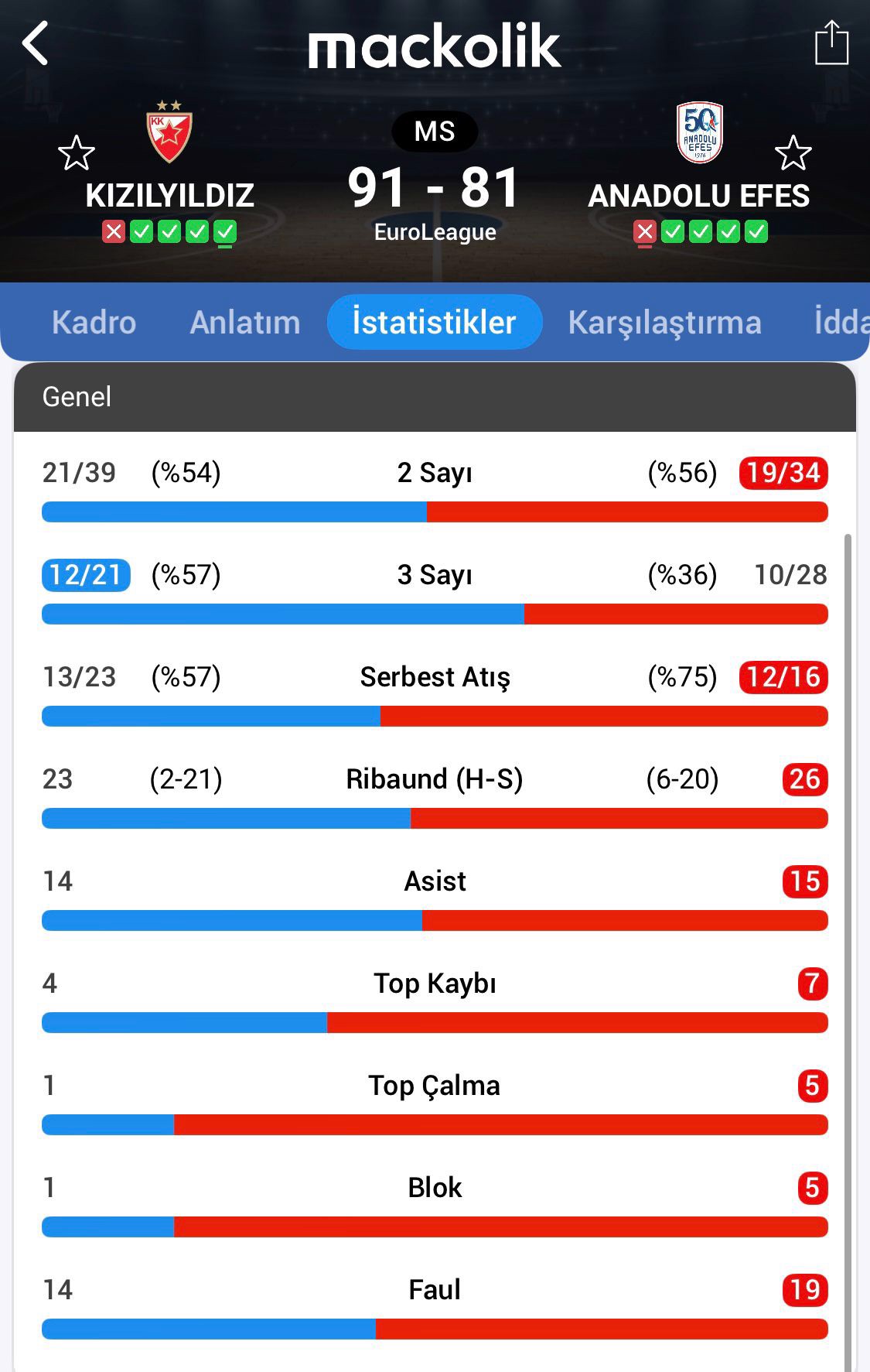 EuroLeague'de temsilcimiz Anadolu Efes, deplasmanda Sırbistan takımı Kızılyıldız'a 91-81 mağlup oldu. Mavi-beyazlılar, organizasyonda 3 maç sonra mağlubiyet yaşadı.