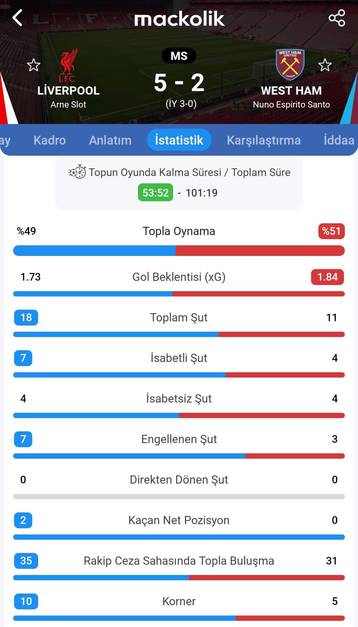 49. dakikada West Ham, Tomas Soucek ile golü buldu. 70. dakikada sahneye çıkan Liverpoollu Cody Gakpo, takımının 4. golüne imza attı.