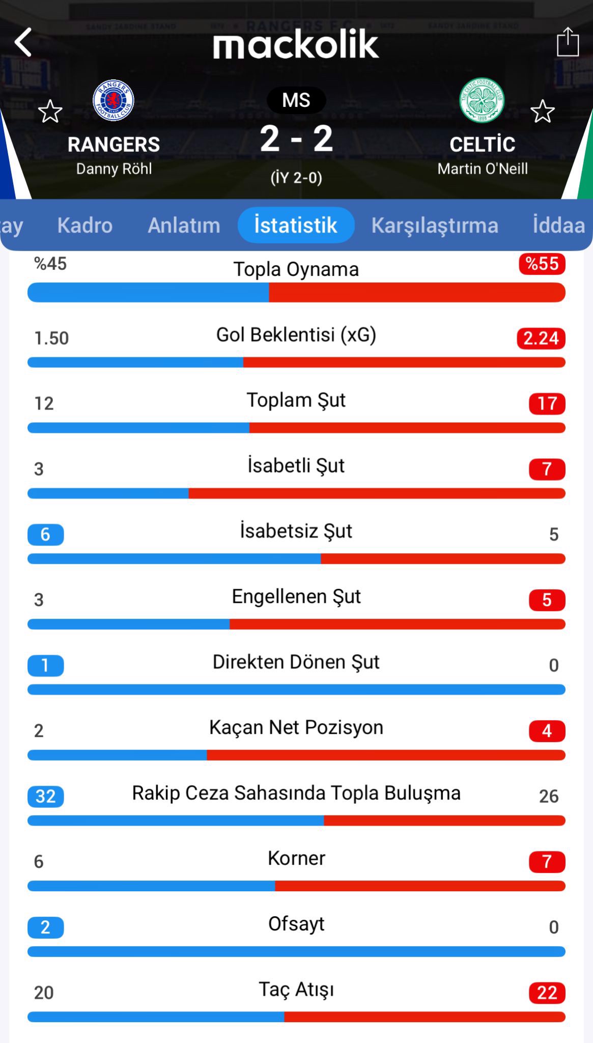 Kalan dakikalarda başka gol olmayınca Rangers ile Celtic, 2-2 berabere kaldı.