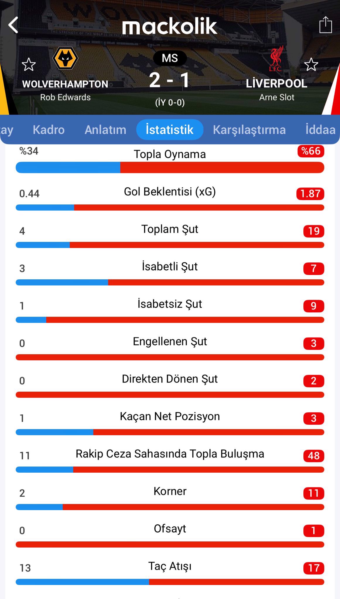 Premier Lig'in 29. haftasında Liverpool, ligin son sırasında bulunan Wolverhampton'a 2-1 mağlup oldu.