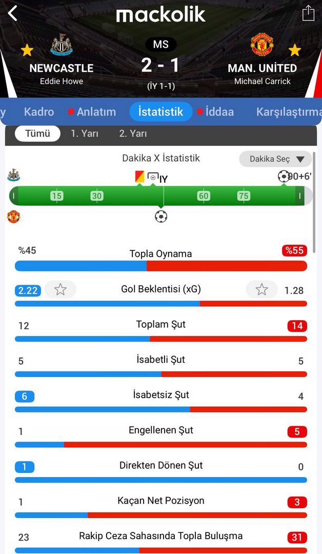Premier Lig'de Newcastle United evinde Manchester United'ı Osula'nın 90. dakikada attığı golle 2-1 mağlup etti. ManU, Carrick yönetiminde ilk kez kaybetti. Ev sahibi ekipte Ramsey 45+1. dakikada gördüğü gördüğü kırmızı kartla takımını 10 kişi bıraktı.